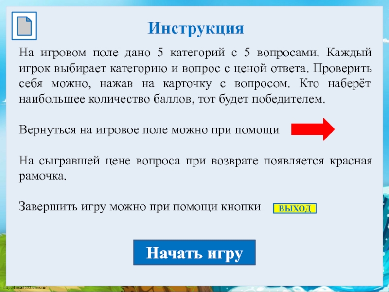 можно, нажав на карточку с вопросом. Кто наберёт наибольшее количество баллов, тот будет победителем.Вернуться на игровое поле можно при помощи
