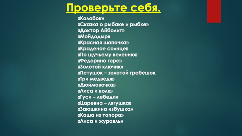 Проверьте себя.«Колобок»«Сказка о рыбаке и рыбке»«Доктор Айболит»«Мойдодыр»«Красная шапочка»«Краденое солнце»«По щучьему велению»«Федорино горе»«Золотой ключик»«Петушок – золотой гребешок«Три медведя»«Дюймовочка»«Лиса