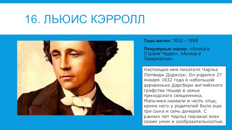 Доджсон. Он родился 27 января 1832 года в небольшой деревеньке Дарсбери английского графства Чешир в семье приходского священника. Мальчика назвали в честь отца, кроме него у родителей было еще три сына и семь дочерей. С ранних лет Чарльз поражал всех своим умом и сообразительностью.
