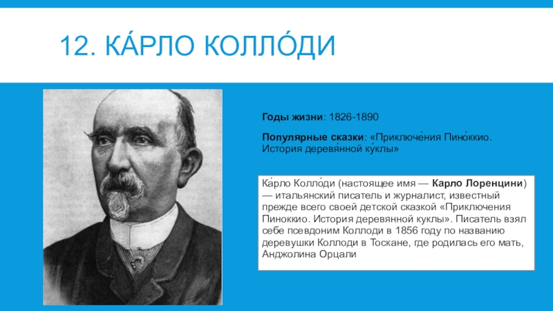 «Приключения Пиноккио. История деревянной куклы». Писатель взял себе псевдоним Коллоди в 1856 году по названию деревушки Коллоди в Тоскане, где родилась его мать, Анджолина Орцали
