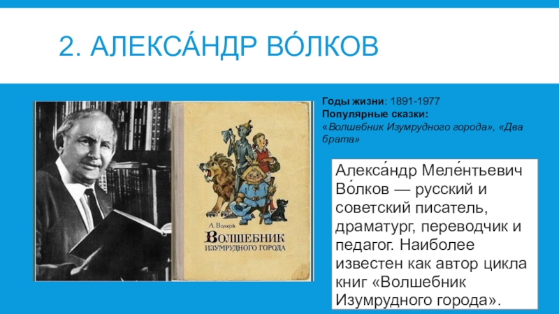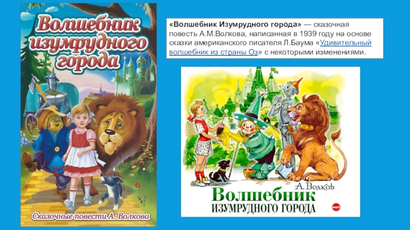 Слайд 10«Волшебник Изумрудного города» — сказочная повесть А.М.Волкова, написанная в 1939 году на основе сказки