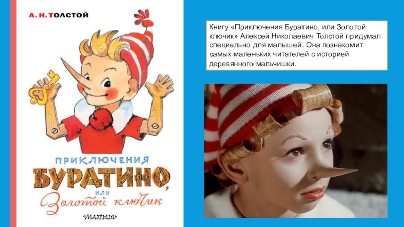 Слайд 44Книгу «Приключения Буратино, или Золотой ключик» Алексей Николаевич Толстой придумал