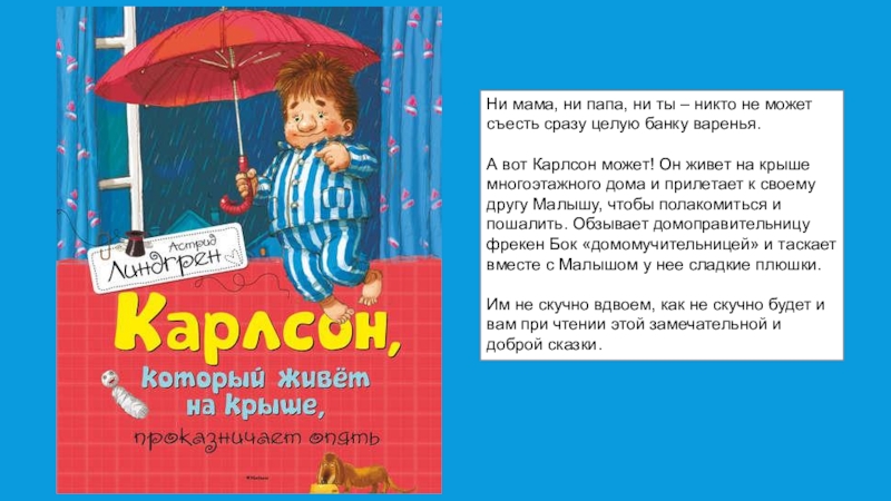 на крыше многоэтажного дома и прилетает к своему другу Малышу, чтобы полакомиться и пошалить. Обзывает домоправительницу фрекен Бок «домомучительницей» и таскает вместе с Малышом у нее сладкие плюшки.