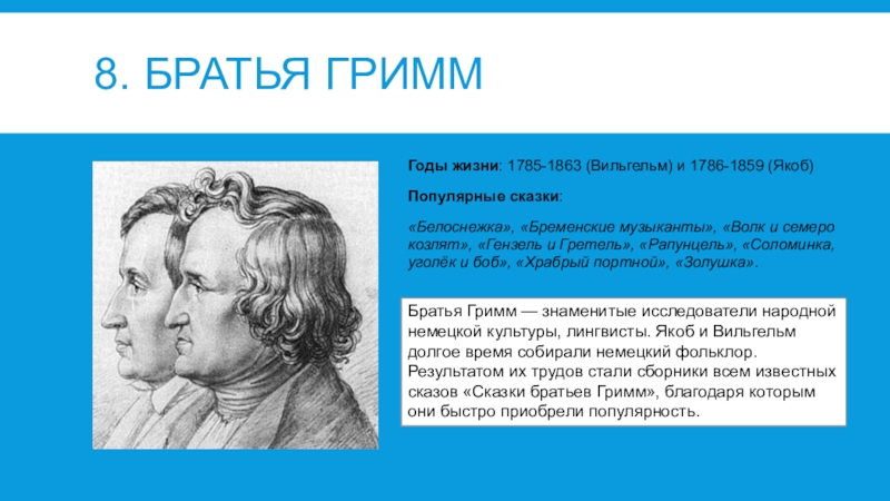 Братья Гримм — знаменитые исследователи народной немецкой культуры, лингвисты. Якоб и Вильгельм долгое время собирали немецкий фольклор. Результатом их трудов стали сборники всем известных сказов «Сказки братьев Гримм», благодаря которым они быстро приобрели популярность.