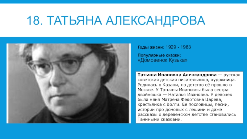 Ивановна Александрова — русская советская детская писательница, художница. Родилась в Казани,