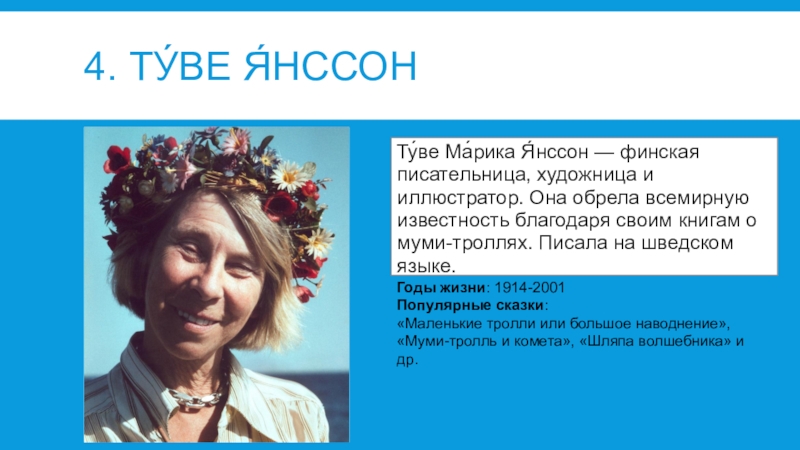 иллюстратор. Она обрела всемирную известность благодаря своим книгам о муми-троллях.