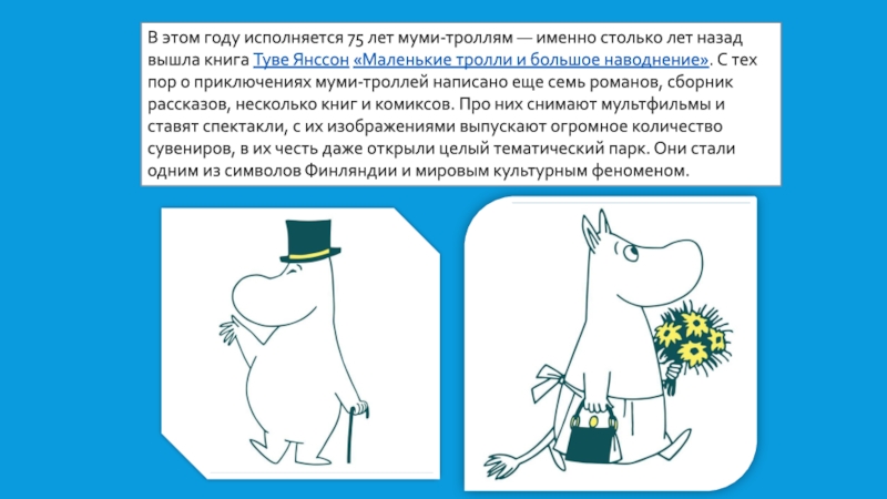 Слайд 17В этом году исполняется 75 лет муми-троллям — именно столько
