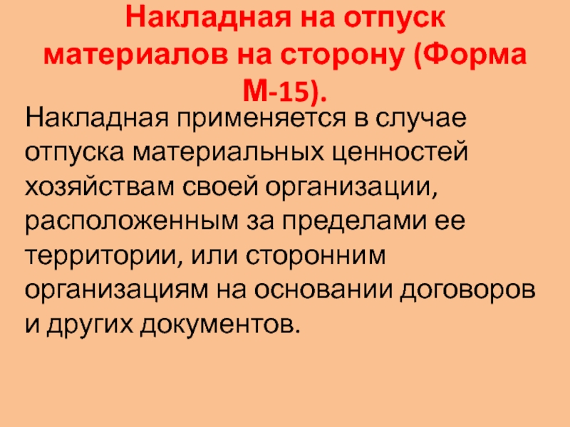 Слайд 54Накладная на отпуск материалов на сторону (Форма М-15).