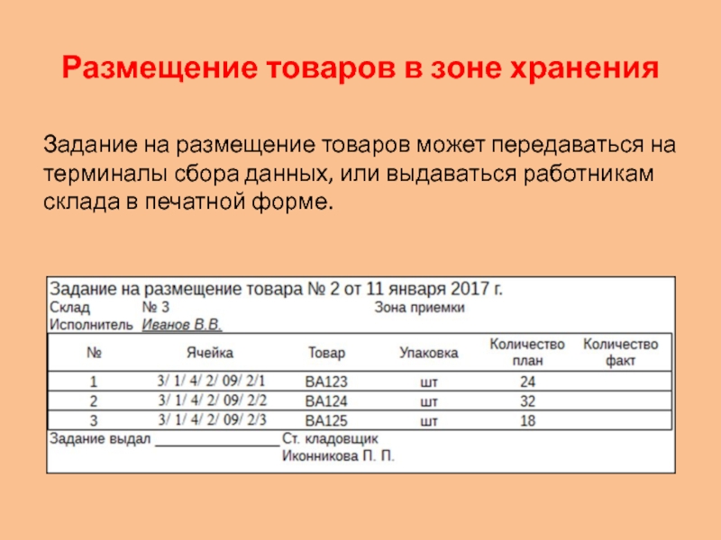 на терминалы сбора данных, или выдаваться работникам склада в печатной