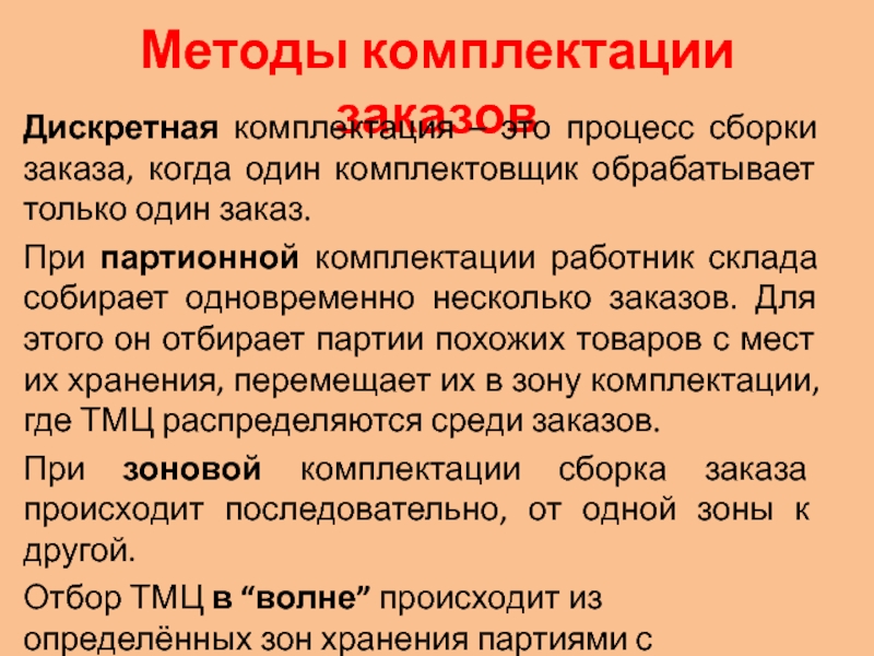 собирает одновременно несколько заказов. Для этого он отбирает партии похожих товаров с мест их хранения, перемещает их в зону комплектации, где ТМЦ распределяются среди заказов.