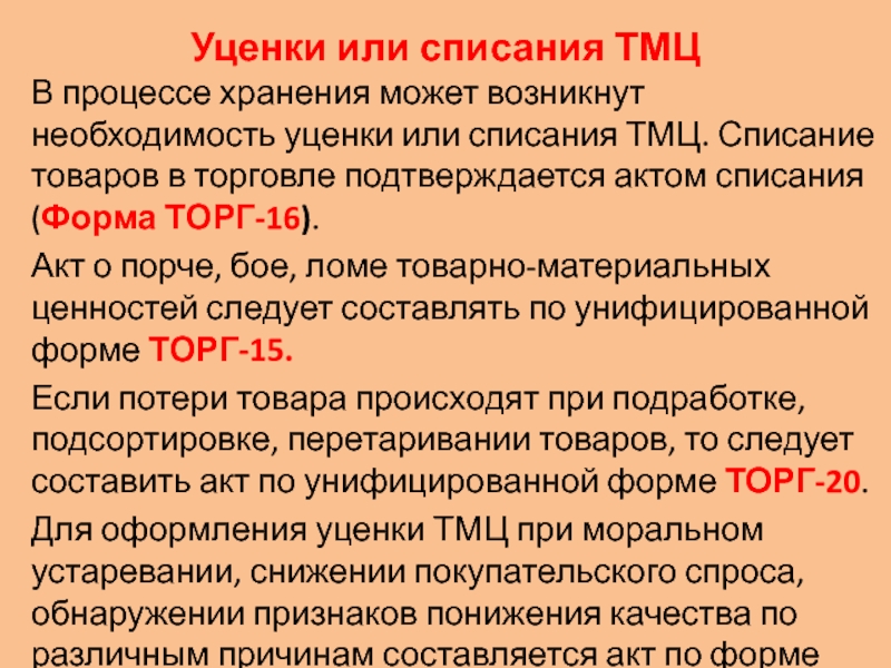 Если потери товара происходят при подработке, подсортировке, перетаривании товаров, то следует составить акт по унифицированной форме ТОРГ-20.