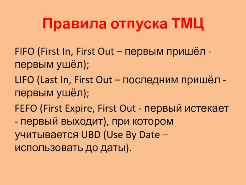FEFO (First Expire, First Out - первый истекает - первый выходит), при котором учитывается UBD (Use By Date – использовать до даты).