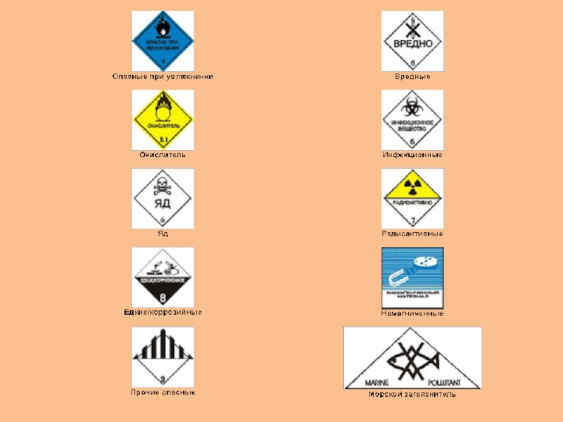 Слайд 13Знаки для маркировки опасных грузов в соответствии с МДОПОГ и ГОСТ 19433-88