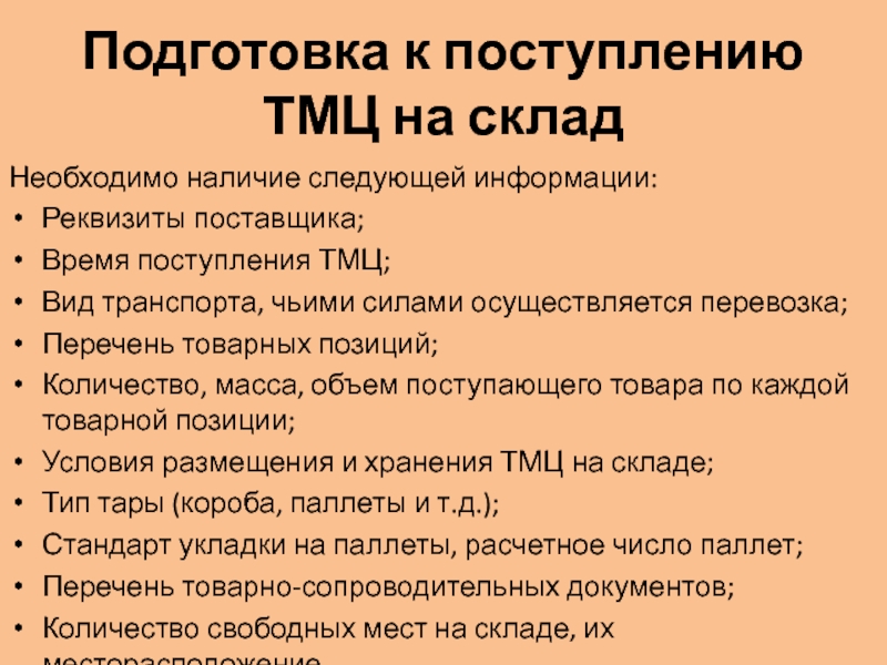 Слайд 2Подготовка к поступлению ТМЦ на склад