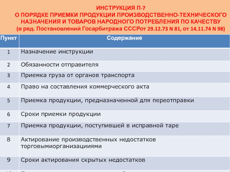 Инструкция П-7 - Инструкция о порядке приемки продукции производственно-технического назначения и товаров народного потребления по качеству. (утв. постановлением Госарбитража СССР от 25 апреля 1966 г. N П-7).