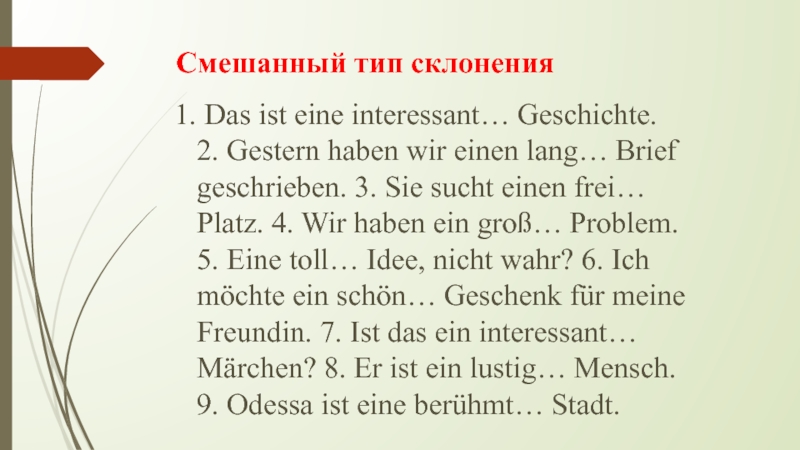 frei… Platz. 4. Wir haben ein groß… Problem. 5. Eine toll… Idee, nicht wahr? 6. Ich möchte ein schön… Geschenk für meine Freundin. 7. Ist das ein interessant… Märchen? 8. Er ist ein lustig… Mensch. 9. Odessa ist eine berühmt… Stadt.