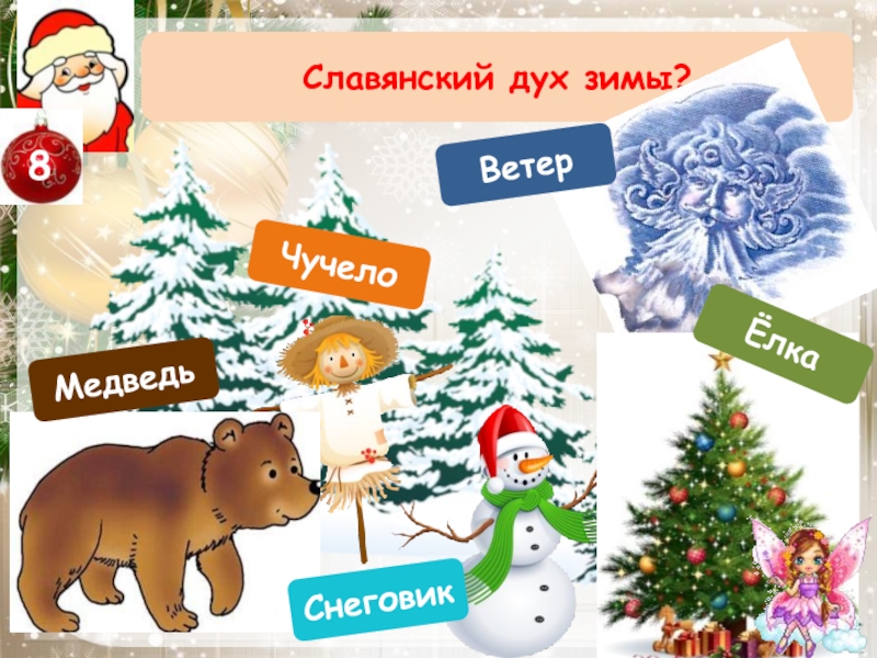 Славянский дух зимы?МедведьЧучелоВетерЁлкаСнеговик