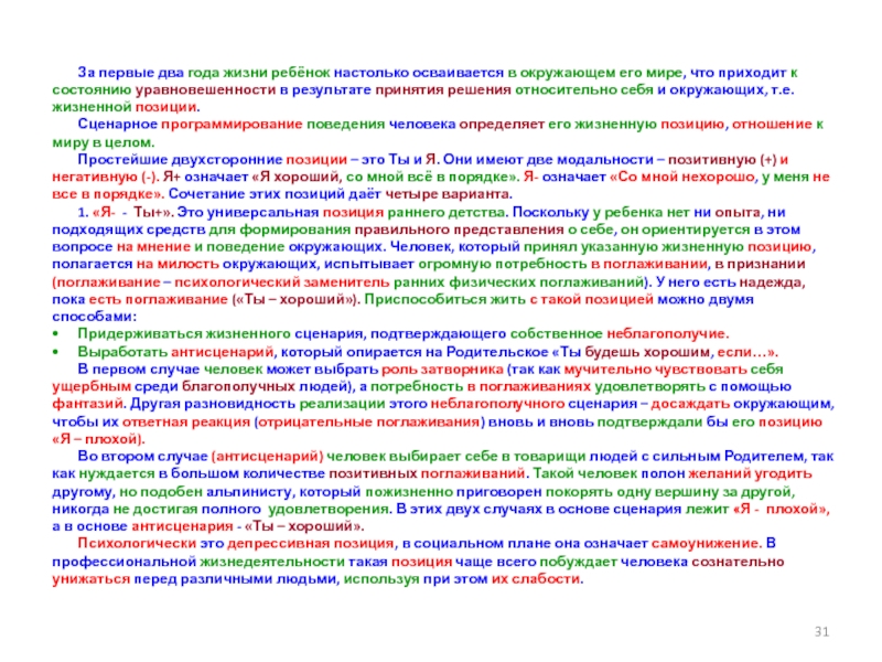 В зависимости от обстоятельств в психике личности могут активизироваться либо Дитя, либо Родитель, либо Взрослый. У зрелой личности Дитя и Родитель гармоничны и находятся под контролем Взрослого.