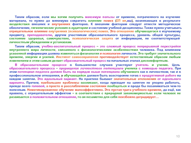 помех ( вн,вш), возникающих в результате воздействия внешних и внутренних факторов. К внешним факторам следует отнести методическое обеспечение, гигиенические условия в аудитории и состояние учебной дисциплины. Также нужно учитывать отрицательное влияние внутренних (психологических) помех. Это отношение обучающегося к изучаемому предмету, преподавателю, другим участникам образовательного процесса, уровень общей культуры, состояние здоровья, самочувствие, психологическая защита от информации, не соответствующей личностным убеждениям и установкам.