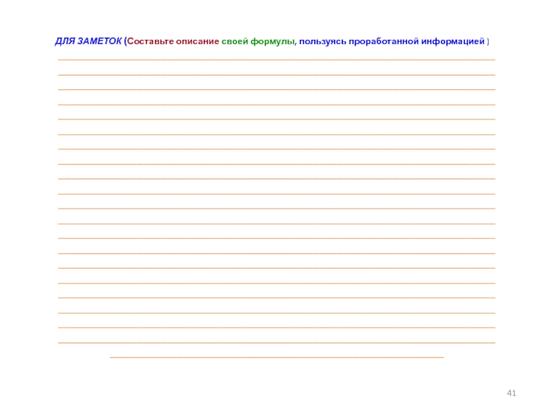 Слайд 41ДЛЯ ЗАМЕТОК (Составьте описание своей формулы, пользуясь проработанной информацией )