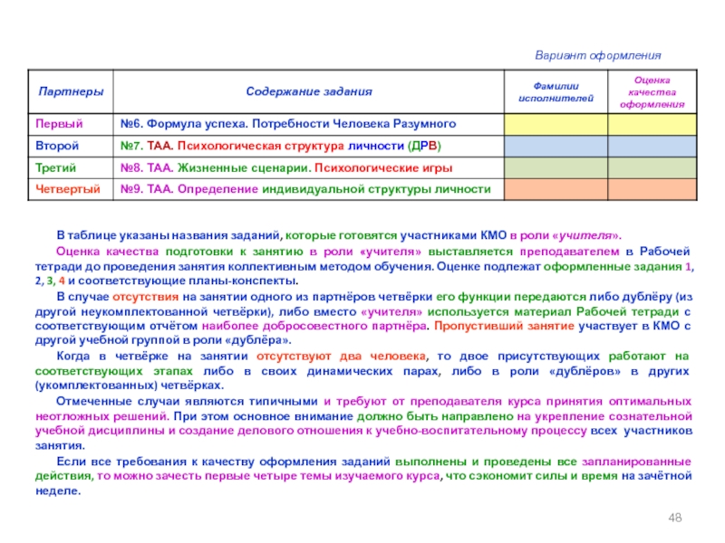 1. В каждой четвёрке преподаватель по мере готовности соответствующего бланка-отчёта помогает устранить замеченные недостатки до проведения КМО, т. е. вместе с каждым партнёром четвёрки создаётся «образцовый» вариант. Попутно с этим проверяется глубина понимания сущности изучаемой информации.