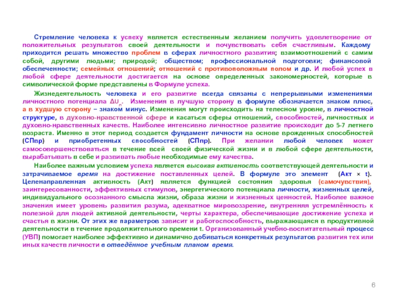 Наиболее важным условием успеха является высокая активность соответствующей деятельности и затрачиваемое время на достижение поставленных целей. В формуле это элемент (Акт t). Целенаправленная активность (Акт) является функцией состояния здоровья (самочувствия), заинтересованности, эффективных стимулов, энергетического потенциала личности, жизненных целей, индивидуального осознанного смысла жизни, образа жизни и жизненных ценностей. Наиболее важное значения имеет уровень развития разума, адекватное мировоззрение, внутренняя устремлённость к полезной для людей активной деятельности, черты характера, обеспечивающие достижение успеха и счастья в жизни. От этих же параметров зависит и работоспособность, выражающаяся в продуктивной деятельности в течение продолжительного времени t. Организованный учебно-воспитательный процесс (УВП) помогает наиболее эффективно и динамично добиваться конкретных результатов развития тех или иных качеств личности в отведённое учебным планом время.