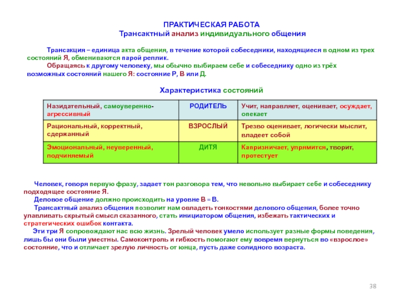Трансактный анализ общения позволит нам овладеть тонкостями делового общения, более точно улавливать скрытый смысл сказанного, стать инициатором общения, избежать тактических и стратегических ошибок контакта.