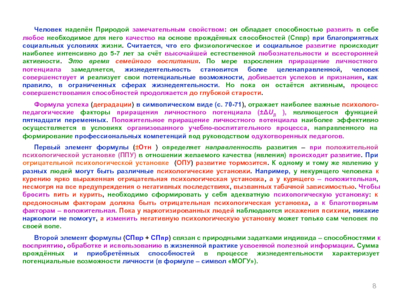 Формула успеха (деградации) в символическом виде (с. 70-71), отражает наиболее важные психолого-педагогические факторы приращения личностного потенциала (UЛ ), являющегося функцией пятнадцати переменных. Положительное приращение личностного потенциала наиболее эффективно осуществляется в условиях организованного учебно-воспитательного процесса, направленного на формирование профессиональных компетенций под руководством одухотворенных педагогов.