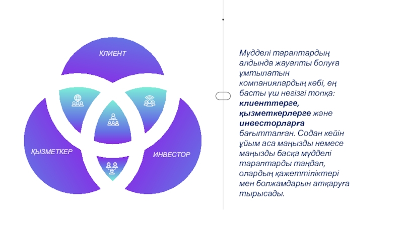 Слайд 15Мүдделі тараптардың алдында жауапты болуға ұмтылатын компаниялардың көбі, ең басты