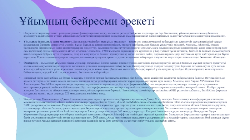 Слайд 21Әлеуметтік жауапкершілікке обструкционистік ұстанымдағы кейбір ұйымдар, әдетте әлеуметтік немесе қоршаған