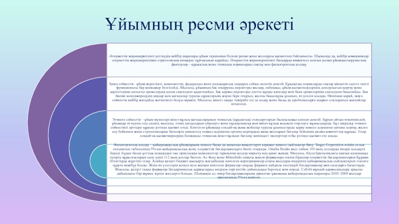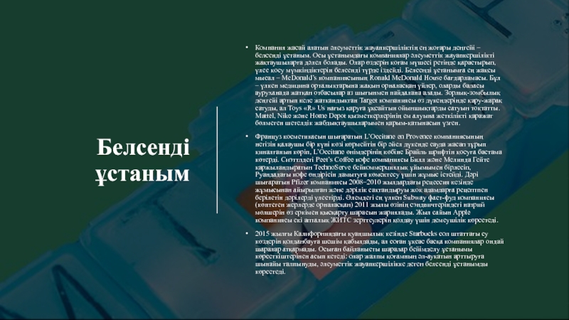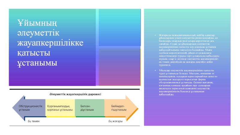 Слайд 20Ұйымның әлеуметтік жауапкершілікке қатысты ұстанымы
