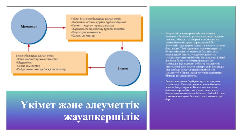 Слайд 26Әлеуметтік жауапкершіліктің аса маңызды элементі – бизнес пен үкімет арасындағы