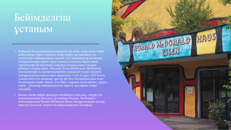 Бизнес қоғам өмірін араласуға мүмкіндік іздегенде, әлеуметтік жауапкершілікке белсенді ұстанымда болады. McDonald’s компаниясының Ronald McDonald House бағдарламасына қолдау көрсетуі белсенді әлеуметтік жауапкершілікті білдіреді.