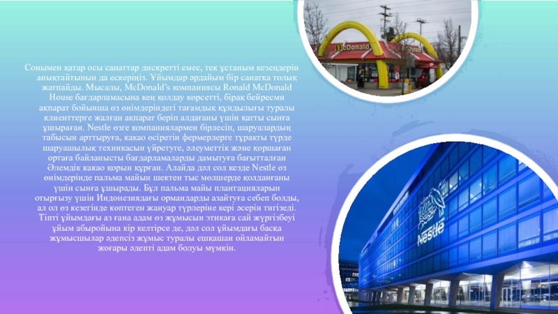Слайд 16Әлеуметтік жауапкершіліктің келесі маңызды саласы табиғат пен қоршаған ортаға қатысты.