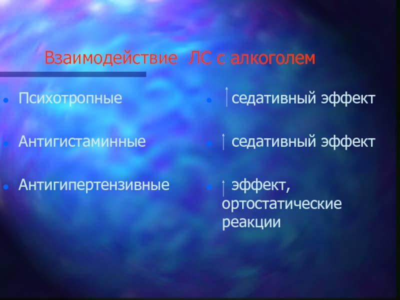 Слайд 39Взаимодействие ЛС с алкоголем