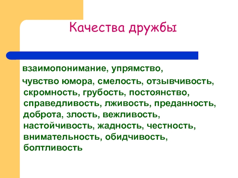 Качества дружбы  взаимопонимание, упрямство,  чувство юмора, смелость, отзывчивость, скромность, грубость, постоянство, справедливость, лживость, преданность, доброта,
