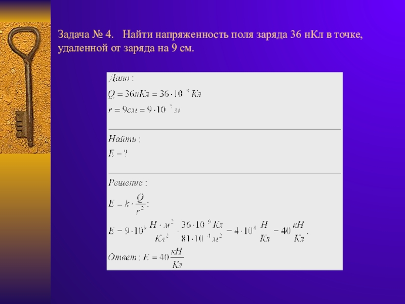 Слайд 25Задача № 4. Найти напряженность поля заряда 36 нКл