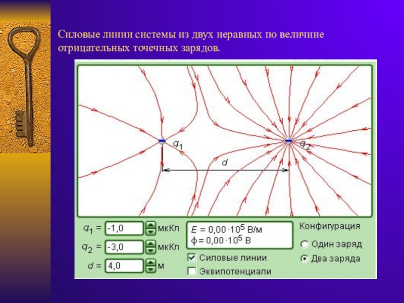 Слайд 16Силовые линии системы из двух неравных по величине отрицательных точечных