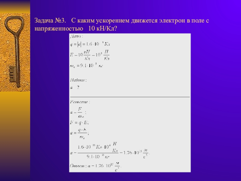 Слайд 24Задача №3. С каким ускорением движется электрон в поле