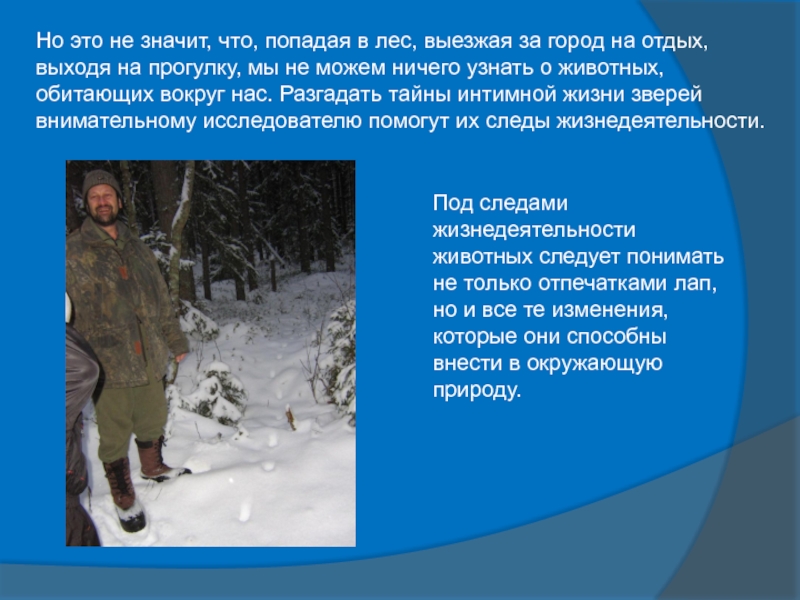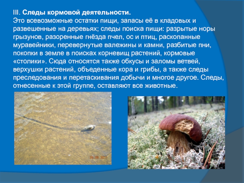 Под следами жизнедеятельности животных следует понимать не только отпечатками лап, но и все те изменения, которые они способны внести в окружающую природу.
