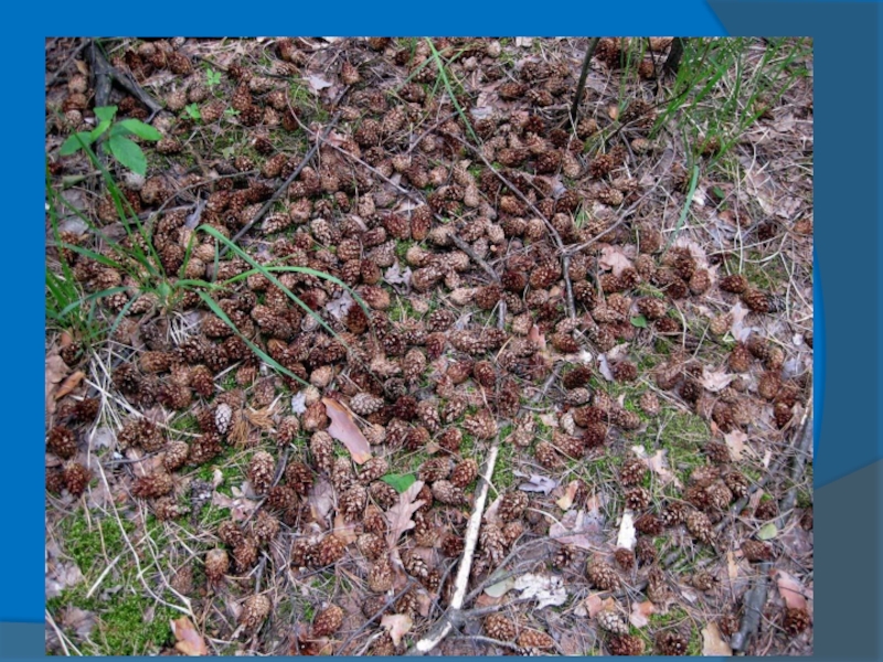Слайд 18Места, в которые дятлы укрепляют шишки, называют «кузницами».Под «кузницами» нередко