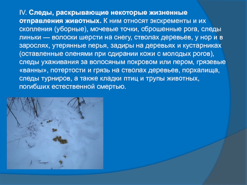 Слайд 27IV. Следы, раскрывающие некоторые жизненные отправления животных. К ним относят