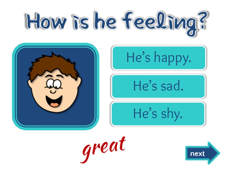 He’s happy.He’s sad.He’s shy. nextgreat