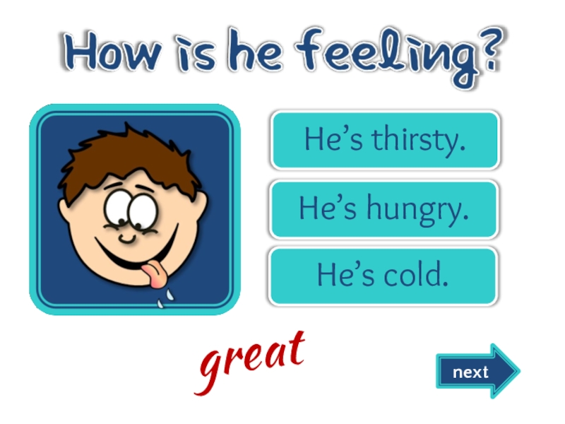 He’s thirsty.He’s hungry.He’s cold.nextgreat