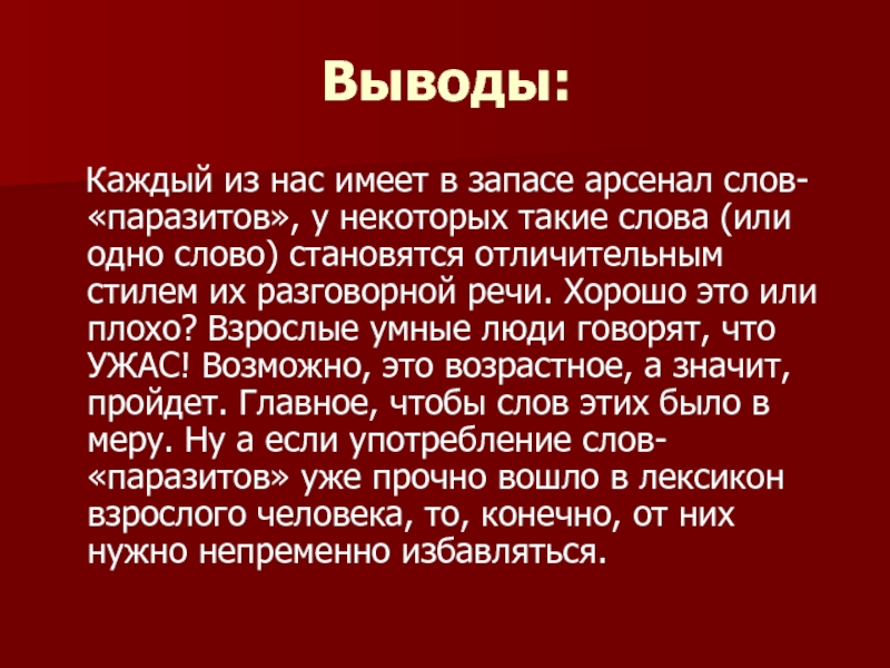 стилем их разговорной речи. Хорошо это или плохо? Взрослые умные люди говорят, что УЖАС! Возможно, это возрастное, а значит, пройдет. Главное, чтобы слов этих было в меру. Ну а если употребление слов-«паразитов» уже прочно вошло в лексикон взрослого человека, то, конечно, от них нужно непременно избавляться.