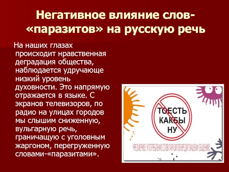 Слайд 9Негативное влияние слов-«паразитов» на русскую речь