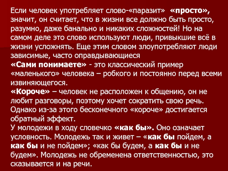 Слайд 7 Если человек употребляет слово-«паразит» «просто», значит, он считает,