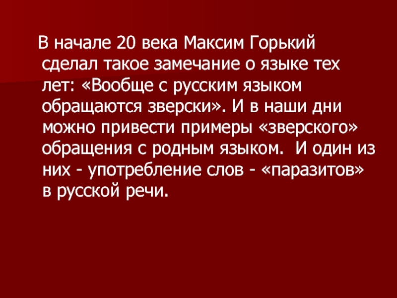 И в наши дни можно привести примеры «зверского» обращения с родным языком. И один из них - употребление слов - «паразитов» в русской речи.