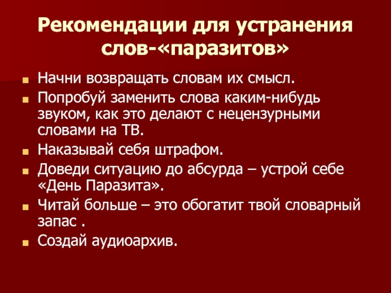 Слайд 12Рекомендации для устранения слов-«паразитов»