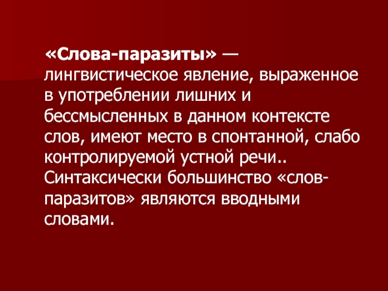 Слайд 4 «Слова-паразиты» — лингвистическое явление, выраженное в употреблении лишних и